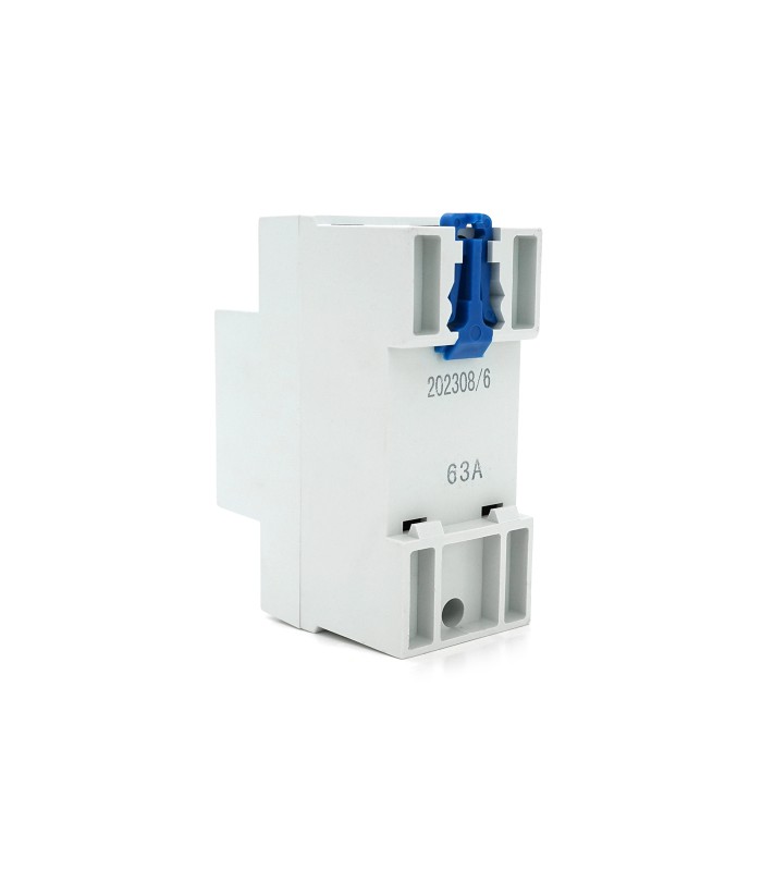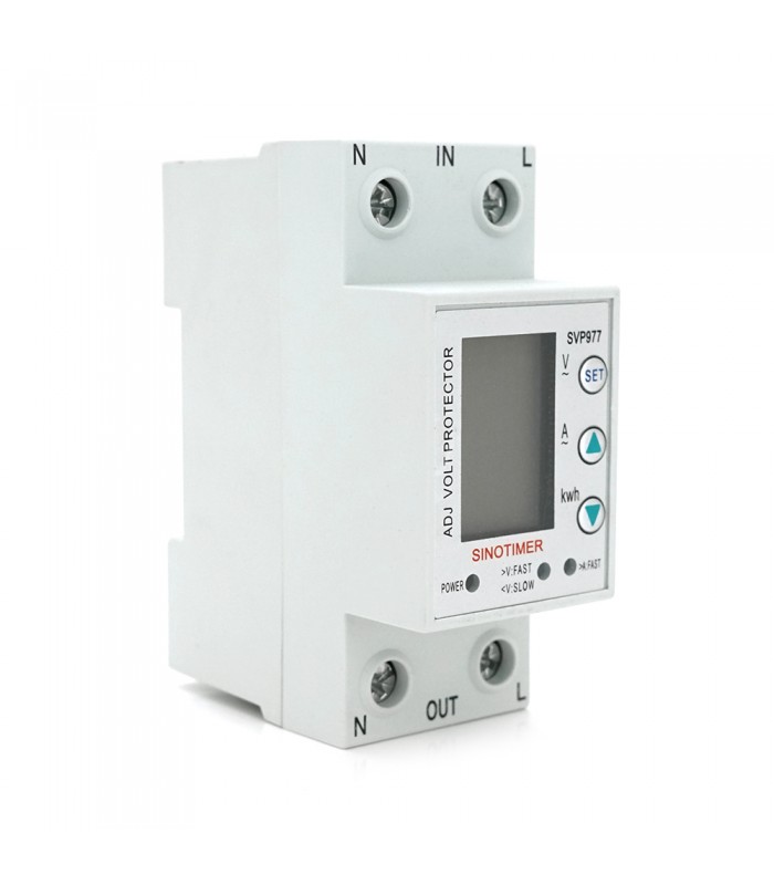 Защитное реле SVP-977 с контролем напряжения (V), тока (A) и мощности (W), с номинальным значением 63A, подходит для использования на DIN-рейке. Размеры составляют 36х65х85 мм.