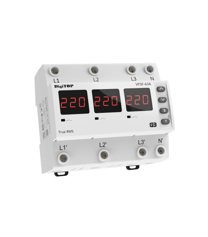 Реле напряжения VP-3F63А M6R представляет собой двухрежимное одно/трехфазное устройство, установленное на DIN-рейку. Оно имеет шесть модулей и оснащено индикатором напряжения (красный). Реле предназначено для работы в диапазоне напряжений 120-270В и обеспечивает защиту электрооборудования от перенапряжений.
